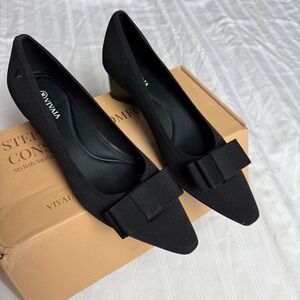 Vivaia Block Heel Pumps Bow Pointed Toe Knit Dress Shoes Black Size 8 EUR 39