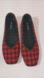 This fashion article worn several times. knit upper. heels are in excellent condition. no box. red and black plaid design. very comfy. sustainable. v cut. square foot.