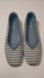 This fashion article worn several times. heels are in great condition. no box. comfy. sustainable. denim stripe in color. square toe. v cut. rubber soles. knit upper.