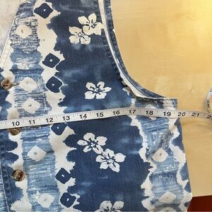 Vintagd blue denim vest with a floral design. No size tag. Fits like medium / large , measurements in photos. Features a button-up front.