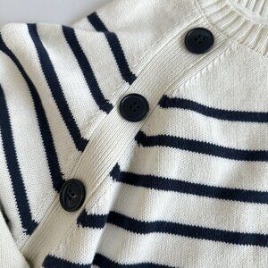 Classic navy and white horizontal Breton stripes with decorative button detail on both shoulders