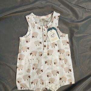 Viverano 100% Cotton Sleeveless Romper Soft and light perfect for the warmer months. Button front and along inseam. Very soft and sweet little sheep pattern the set. Very gender neutral