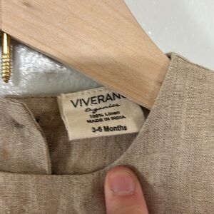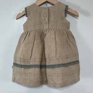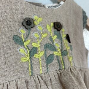 Viverano Boho Tan 100% Linen Baby Girl’s Dress with Floral Embroidery Size 3-6M