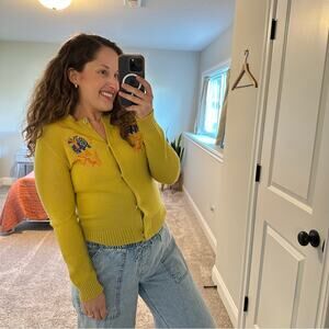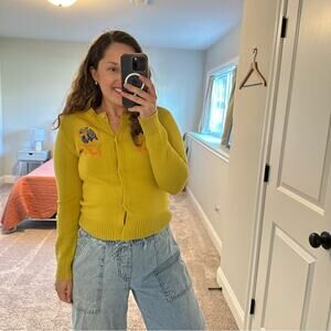 I adore this gorgeous designer Vivetta green chartreuse yellow pure wool snap button front cardigan sweater with adorable elephant embroidery