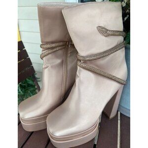 Vivianly Women Platform Boots Chunky High Heel Ankle Bootis Square Toe Nude SZ 9