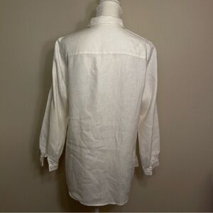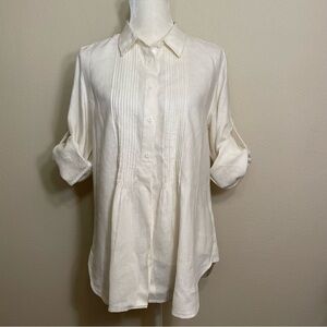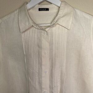 Vivid linen pleated blouse with roll tab sleeves. 100% natural linen. Button cuff long sleeve with button and tab to wear rolled. Natural cream color. Front has 5 exposed buttons and 3 hidden buttons. Pleated front slightly flared design. Approximate measurements laying flat: the bust is 21” and the length is 29”. Great condition. Size L