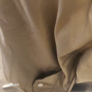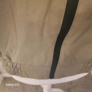 Vivieene Hue Double zip jacket. NWT. Size Large. No rips/stains or tears. Perfect. Material: Polyester. Silky lined interior. Cinched bottom and at wrists. Color is a tan with black zip/details. Measurements: Pit to Pit: 20 inches. Shoulder to bottom: 24 inches. Side pockets with button closure. Smoke free home. No odors. All offers are welcome. Thank you!