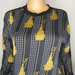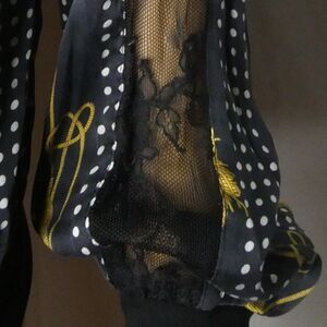 Gorgeous vintage piece! Long sleeve with all-over rope tassel and polka dot print, black contrast hems and black sheer floral lace down the sleeves. So pretty and unique! In excellent gently preloved condition.
