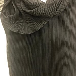 Black with sheer overlay and ruffled embellished detail on right shoulder