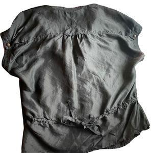 Gorgeous black short sleeve dress top. 100% silk. Short puff sleeves with a pearl button closure on each sleeve. Pearl like button down. Tie back to make it fitted and the perfect shape for your body. Excellent Condition