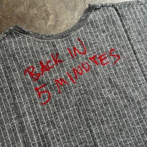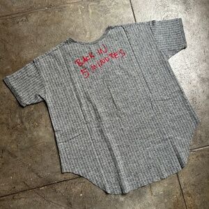 brand new from 2015 or 2016 anglomania oversized, baseball jersey style heavy sweatshirt open 24 hours shirt . text says "back in 5 minutes" on the back lol . heavy sweatshirt material . the text has the texture of felt . sweatshirt style ribbing at sleeves . size l but could be xl or xxl . please refer to the measurements in the photos . raw hem at the bottom