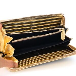 The interior is beautifully lined with metallic gold leather and black fabric, offering 12 card slots, multiple bill compartments, and a secure zippered coin pocket for added functionality. The zip-around closure keeps everything safe while maintaining a sleek, structured silhouette—perfect for both everyday use and as a stylish statement accessory.