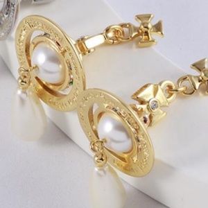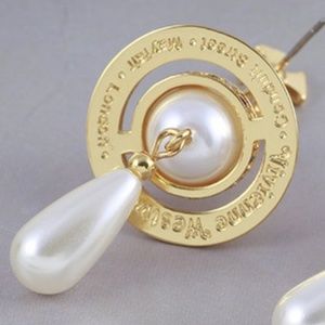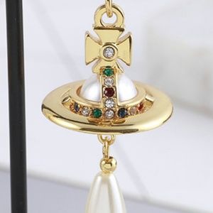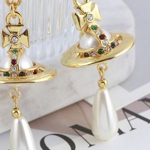 Elegant gold earrings with pearl accents. Features colorful gemstone details. Iconic Vivienne Westwood design.