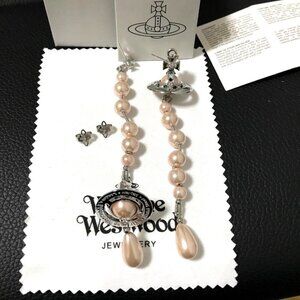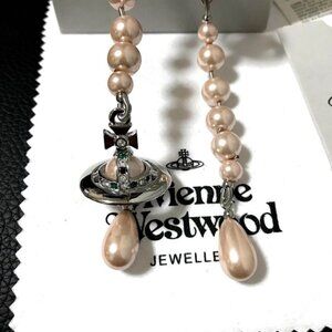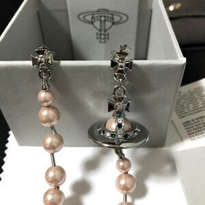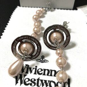 Vivienne Westwood Long Pearl Earrings Silver Pink Orb Drop with drawstring
