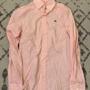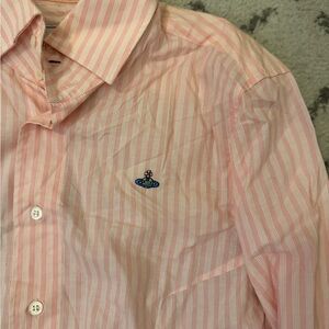 Classic Vivienne Westwood piece featuring a subtle pink & white stripe pattern with the iconic embroidered orb logo on the chest. Smart yet bold, perfect for both casual styling and dressed-up looks.