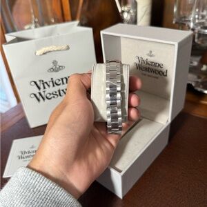 Brand NEW with everyhting you see included. Original paper bag, box, and papers. It’s a two-tone watch by Vivienne Westwood. Features a sleek silver and pink design. Perfect for any occasion. Plastic still on