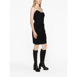 In keeping with Vivienne Westwood’s affinity for sculptural silhouettes, this strapless minidress borrows elements from classic corsetry. The draped bodice falls to an asymmetric hem.