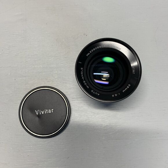 The Vivitar 28mm 1:2.5 Auto Wide-Angle Lens for Canon FD series is a high-quality lens designed for Canon cameras. It features a maximum aperture of f/2.8 and a focal length of 28mm, providing a wide-angle view for capturing landscapes, architecture, and more. The lens is constructed with durable brass materials and comes in a convenient case for easy storage and transport. With auto focus capabilities, this Vivitar lens is compatible with Canon FD mount cameras, making it a practical and versatile choice for photographers looking to expand their creative capabilities.