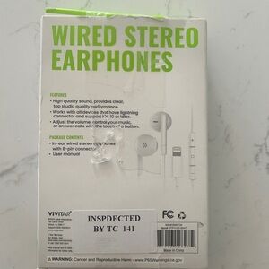 Vivitar wired earphones with Lightning connector, in-line mic, and tangle-free cables. Compatible with iOS 10+. Please note: box is visibly damaged but item is unused.