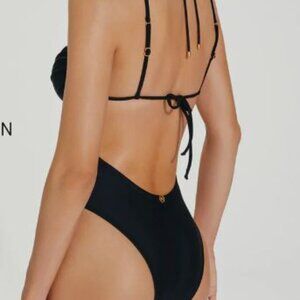 This elegant black one-piece swimsuit by Vix showcases a deep plunging V-neckline with strappy center details and high-cut leg openings for a sleek, elongating look. The structured cups and form-fitting material create a flattering silhouette, embodying a sophisticated and contemporary style.