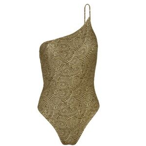 Tags: swim, resort, resort wear, beach, vacation, travel, bodysuit, versatile, travel, lake life, summer, olive green, patterned, designer, one shoulder, one piece, coastal,