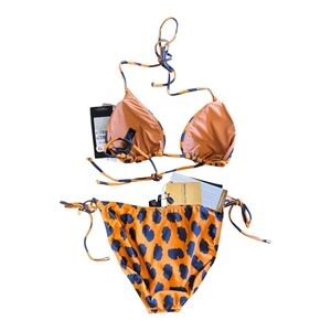 Vix Triangle Top and Side Tie Full Bottom Bikini - Orange/ Navy Cheetah NWT