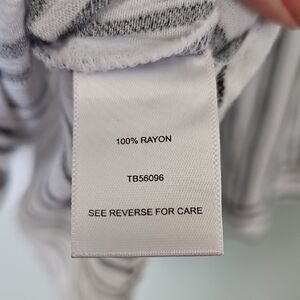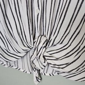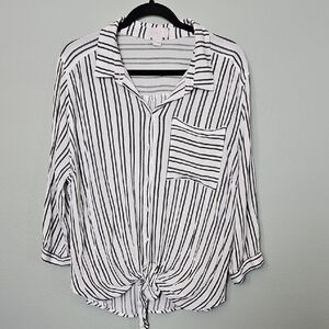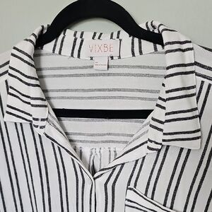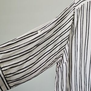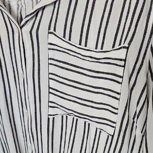Chic faded black and white stripes. Button-down style with front pocket. Casual and versatile. Lightweight, gauze fabric feel. Airy and comfortable. Roll tab sleeves. 3/4 sleeves. Can be dressed up for the office or worn more casually for the weekends. Has a collar. Lightly sheer. Spring, Summer, work, office, career, brunch, hangout, boho, grunge, laid back, relaxed, curvy, plus, neutral, feminine, girly, workplace. There is a run across the upper back, see close up.
