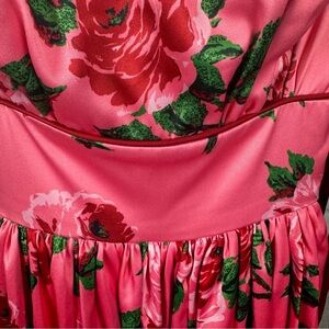 Vixen dress size XS. 1950s swing style dress. Pink with red floral details. Adjustable straps. Beautiful dress! Does not come with gloves or belt. Does have the shoulder ties. Great condition, except for a run in the black along the fabric, but does not go completely through fabric (see pics). Smoke free home.