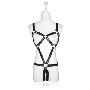Two over-shoulder straps lead into diamond-shaped leather frames that highlight the bust with a daring open-front design. A sleek leather line continues down the torso, forming a striking V across the abdomen, creating sensual structure and dramatic symmetry.