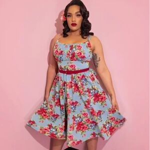 Gorgeous red and pink vintage rose print on blue background in one of the most popular Vixen styles, the Ingenue. Wide waist section and shirring at bust makes for a very flattering and feminine silhouette. As with all Vixen Ingenues, this has adjustable straps and deep pockets. A classic, comfortable beauty that can be worn year-round (match her with a coordinating cardigan in the cooler months), you can't go wrong with Micheline Pitt! Belt included.