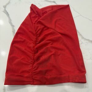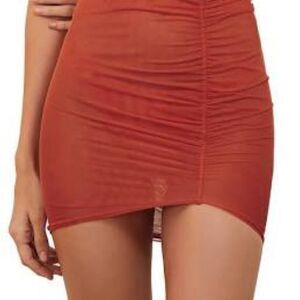 A bout the brand: Luxury swim, resort and more. Solid Lynn Mini Skirt in orange with ruched fabric, and elastic waist