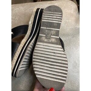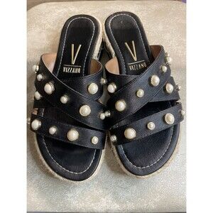 Very nice pair of Vazzano black slides with hemp detail and pearls on the straps. These are very nice for Cruz or for a beach vacation. Theyre very comfortable and look adorable dressed up or down. They are in very nice shape with no issues. They are marked size 8, but I feel like they run a little large. Im an 8 1/2 and they fit me just fine. Approximately, 9.75 inches on the foot bed. Platform measures about 1.5 inches at tallest. No issues no missing pearls. Very nice shoes.