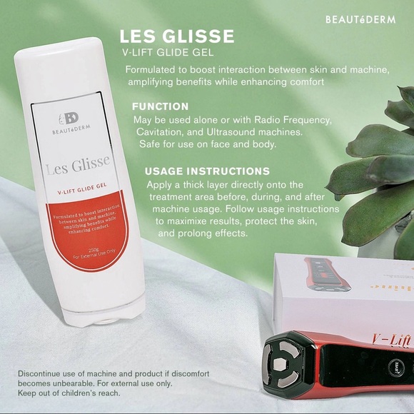 And now best used with the new BEAUTéDERM's Les Glisse V-Lift Glide Gel, formulated to boost interaction between skin and machine, amplifying benefits while enhancing comfort.