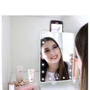 Hollywood tech mirror has an array of features including 2 built-in Bluetooth speakers so now you can enjoy your favorite playlist, talk on the phone or even watch videos as you beautify. This new mirror also has 20 adjustable LED lights, swivels 180’ to easily adjust to any angle, a 10X mirror attachment, a built-in phone pocket for easy access/video watching and easily recharges so there are no more batteries to replace! built in wireless Qi phone charger! Now you can get ready while jamming/talking/watching and even be able to charge your phone. There is damage to the box but not contents