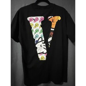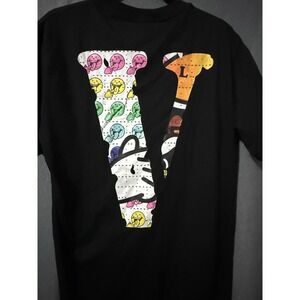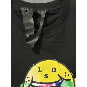 The Vlone Friends LSD Smiley Face Tee-Shirt is a size large streetwear t-shirt featuring a black design with a yellow smiley face character. Made from cotton, this short sleeve shirt has a crew neck and a regular fit. Manufactured between 2020-2029, this unique t-shirt is a rare find for fans of the Friends collection by Vlone. Perfect for men looking to add a pop of psychedelic color to their wardrobe.