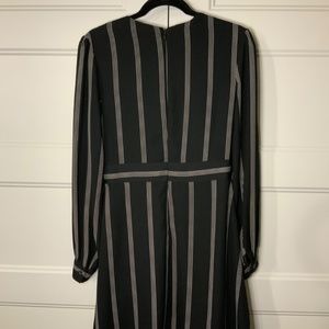 Black deep v-neck dress, white pinstripes. Button cuffs and zipper in the back.