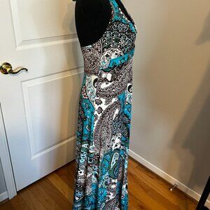 Make a bold statement with this eye-catching maxi dress featuring a mesmerizing paisley and swirl pattern in shades of turquoise, green and brown on a soft stretchy knit fabric. The deep V-neckline and sleeveless cut create a flattering fit that subtly hugs your curves. The vibrant print artfully combines classic and contemporary elements for a look that's both timelessly chic and on-trend. Slip into this head-turning dress for any occasion where you want to turn heads - from summer garden parties to evenings out on the town. The flowy skirt provides beautiful draping and movement with every step. Pair with strappy heels or dressy sandals to complete this stunning ensemble. This versatile maxi will quickly become a favorite in your wardrobe.