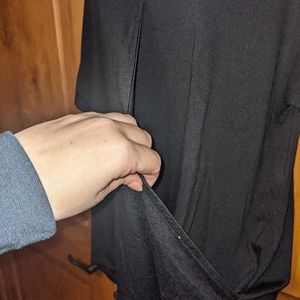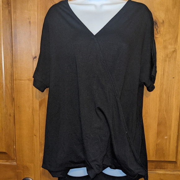Incredibly comfortable. Fits like an XL. Front is layered in a V and slightly gathered at the bottom. Soft and forgiving. Great with jeans or for a comfortable day at work.