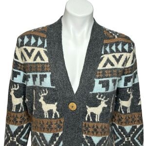 V-neck button up Christmas cardigan size S/M. Reindeer and Christmas trees. Super soft. Great condition. 72% acrylic 25% polyester 3% spandex. Length 26.5” Chest 22”.