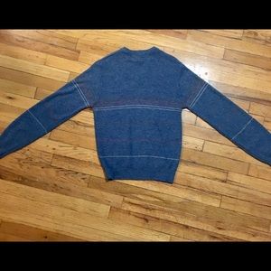 V-neck lighter weight sweater-blue with grey/orange/pink stripes and then speckles all over. Used- no holes or marks