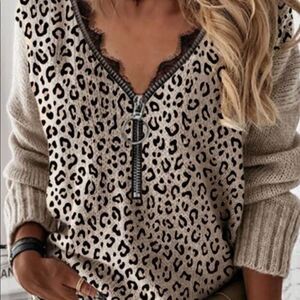 V-neck long sleeve animal print top with zipper and lace trim. Large -XL