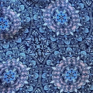 Beautiful V-neck blouse medallion blue, purple and pink pattern sleeves are three-quarter with loose elastic. Looks great with a pair of jeans. Came as a stitch fix great brand