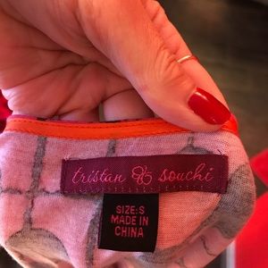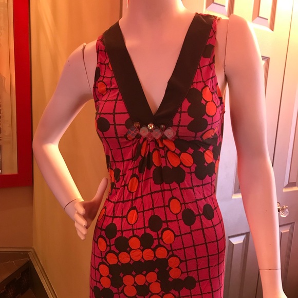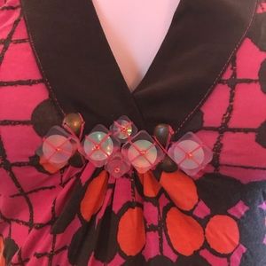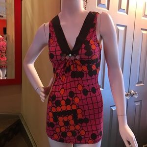 Super soft v-neck top in orange, pink, and brown. Colors flatter skin color. Figure hugging.