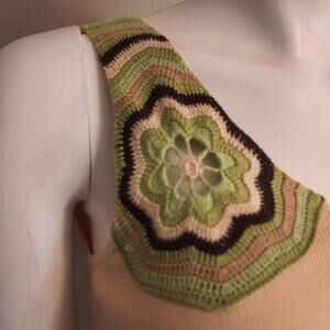 Unique Crochet Floral “Granny Square” Shoulder Cutout In Lime Green, Tan, Brown, Cream