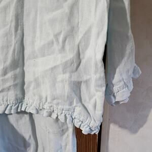 Soft linen dream set for slow mornings and cozy nights. Vintage Subtle Tones two-piece sleepwear in whisper-blue 100% linen with real mother of pearl buttons and made in USA quality.