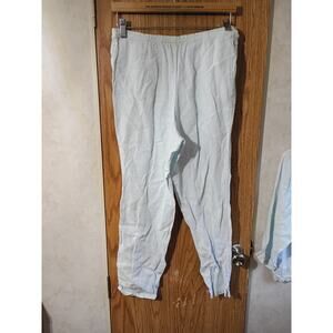 Two-piece pajama / lounge set by Subtle Tones, true vintage late 80s/90s. Set includes a button front top with mother of pearl buttons and matching pull-on pants. Top has a relaxed, slightly boxy fit with button front and long sleeves. Pants have elastic waist plus side mother of pearl button detail for extra ease and adjustability. 100% linen fabric is lightweight, breathable, and softens beautifully with wear. Made in USA, RN 88259. Tag size XS – best for modern petite / XS.