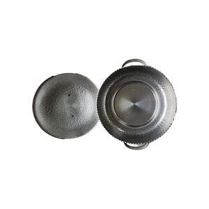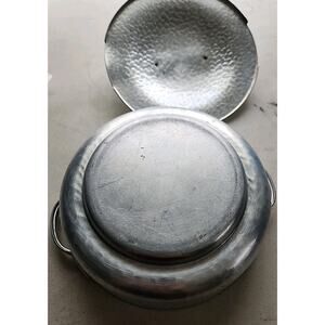 Vintage hammered aluminum casserole dish holder with lid. Hold a dish 8" wide and 3" deep. No insert. Some wear due to age and use. Please see pictures.