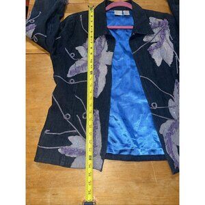 This vintage Bleu Bayou Blue Denim Jacket is a stylish and eye-catching piece with a floral pattern and embellishments like sequins and rope trim. The 3/4 sleeve and mid-length jacket features an open closure, making it perfect for various occasions from casual outings to formal events. The denim outer shell and polyester lining ensure durability and comfort, while the artsy design adds a unique touch to your wardrobe. Perfect for summer, fall, or spring, this jacket is a versatile and fashionable choice for women's outerwear.
