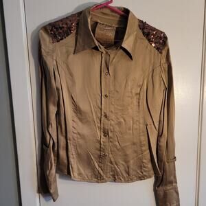 Statement silk blouse with that early-2000s edge — luxe bronze satin finish and sequin-detailed cuffs bring instant drama. A rare Da Nang piece, perfect for collectors or anyone looking to tap Y2K glamour with modern styling.