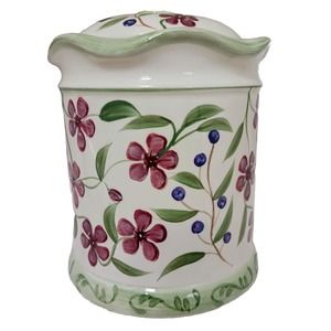 This vintage, hand-painted ceramic canister with lid is a beautiful addition to any kitchen or home. The canister features a charming floral and butterfly design, with blue berries and a bohemian, cottagecore style.